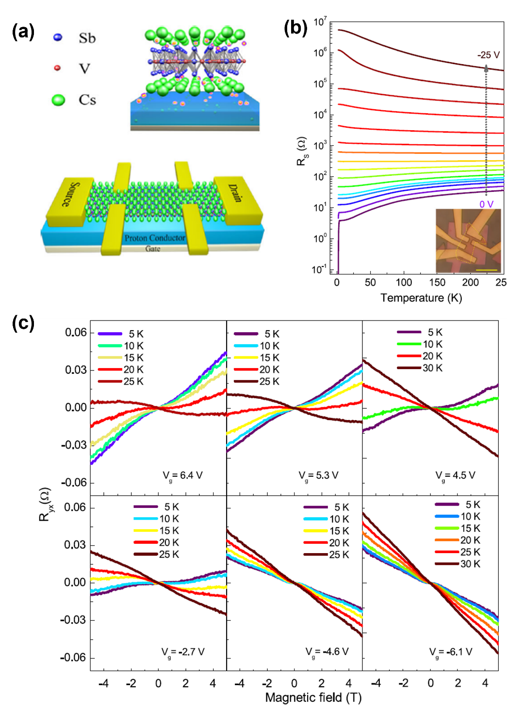 (a)基于固态质子门电压调控技术构建的二维笼目金属体系CsV3Sb5的场效应晶体管。(b)门电压调控的较薄CsV3Sb5纳米片的方块电阻随温度的变化关系。(c)超大反常霍尔效应在不同门电压和温度下的演化情况。